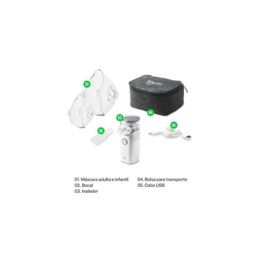1 Inalador; 1 Máscara infantil; 1 Máscara adulto; 1 Bocal; 1 Manual de instruções; 1 Bolsa