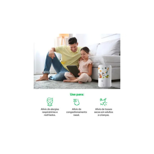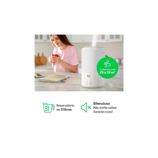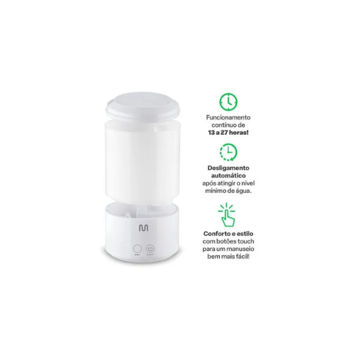 O Pure Air da Multi Saúde proporciona maior qualidade no ar que você e sua família respiram através da umidificação do ambiente, auxiliando na maior hidratação das vias respiratórias, e na redução das tosses, congestões nasais e problemas respiratórios derivados do tempo seco. Possui desligamento automático após o esvaziamento do reservatório e conta com funcionamento silencioso e contínuo entre 13 e até 27 horas.